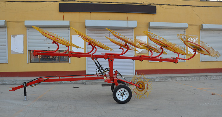 ORaks de roda do tratorsão o tipo de máquina usada para a colheita de grama espalhada no chão em tiras longas. O objetivo da colheitadeira é permitir que a grama seque bem e facilite a coleção de feno seco. De acordo com a relação entre a direção das tiras de feno e a direção para a frente da máquina, elas podem ser divididas em duas categorias principais: horizontal e lateral. As tiras de feno integradas são paralelas à direção direta da máquina. A forma das tiras de feno é arrumada, solta e uniforme. A distância do movimento da grama é pequena e há poucas impurezas, tornando-a adequada para pastagens naturais e pastagens artificiais de alto rendimento.