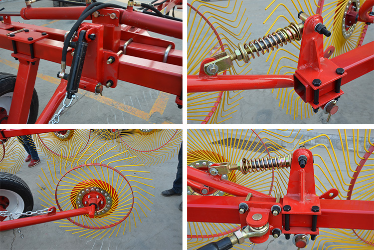Os ancinhos de feno da roda estão equipados com um amplo design de dentes para cobrir uma área de trabalho mais ampla ao mesmo tempo, aumentando significativamente a eficiência de ataque. Ao mesmo tempo, os dentes de ancinho são feitos de materiais resistentes ao desgaste para garantir que eles possam permanecer nítidos por um longo tempo, reduzindo efetivamente a resistência durante o processo de rajamento, tornando a operação mais suave.